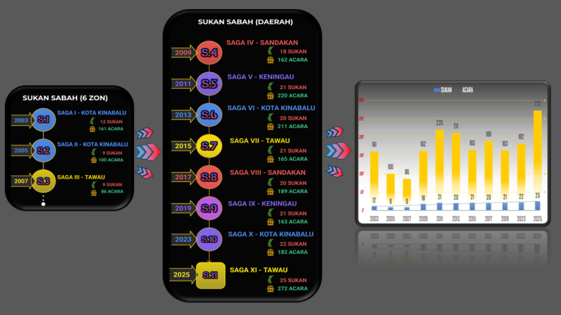 | SAGA VI | 2013 | KOTA KINABALU | 25 DAERAH | KOTA KINABALU | 60 EMAS | 20 SUKAN | 211 | - |